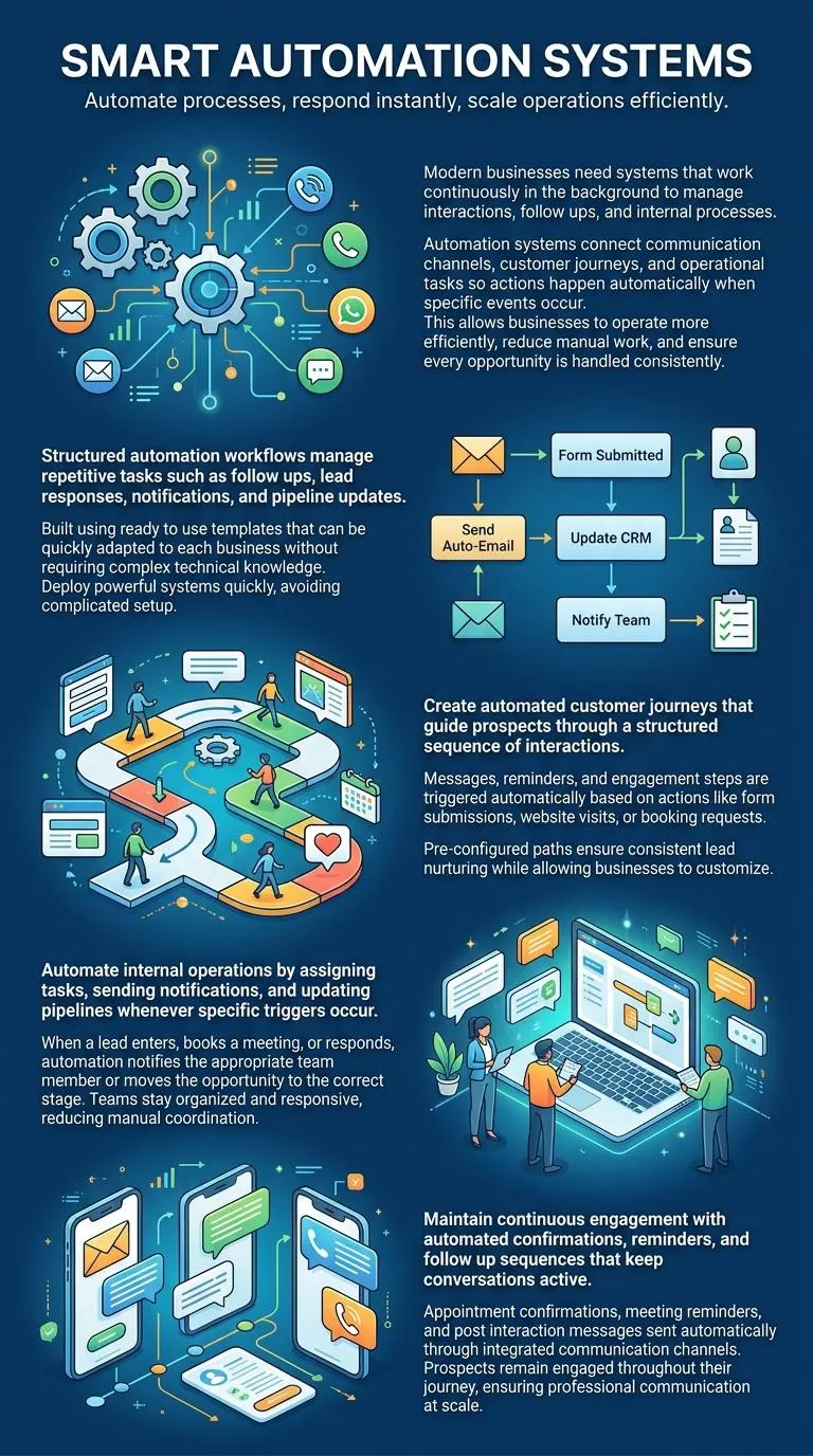 Modern businesses need systems that work continuously in the background to manage interactions, follow ups, and internal processes. Automation systems connect communication channels, customer journeys, and operational tasks so actions happen automatically when specific events occur. This allows businesses to operate more efficiently, reduce manual work, and ensure every opportunity is handled consistently.