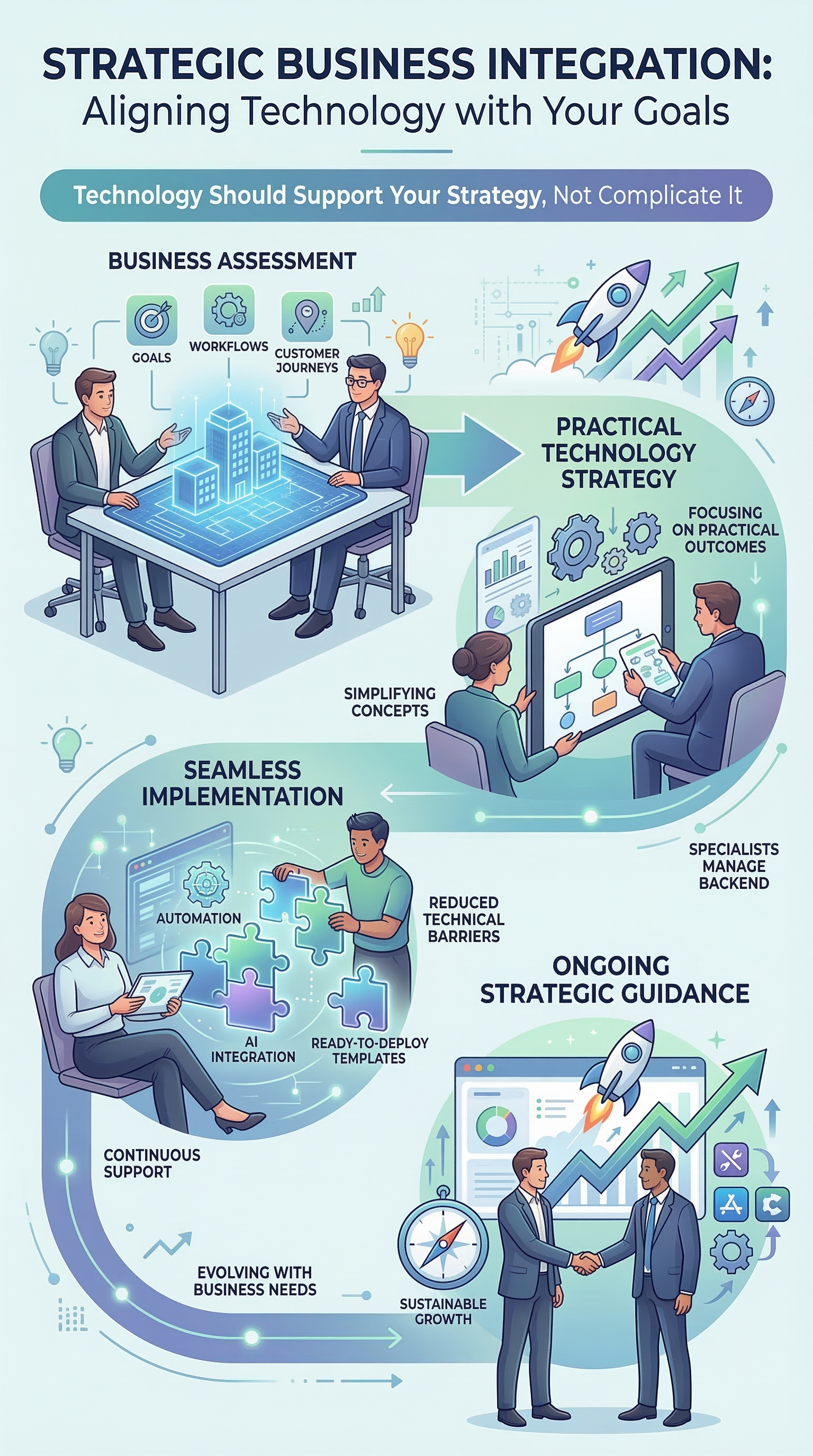Provide ongoing strategic guidance to ensure technology continues to support business growth as tools and platforms evolve. Instead of simply delivering a technical setup, the goal is to integrate technology into the overall business model in a sustainable way. By combining consultancy with implementation, businesses gain both the systems and the strategic direction needed to grow confidently with modern digital tools.